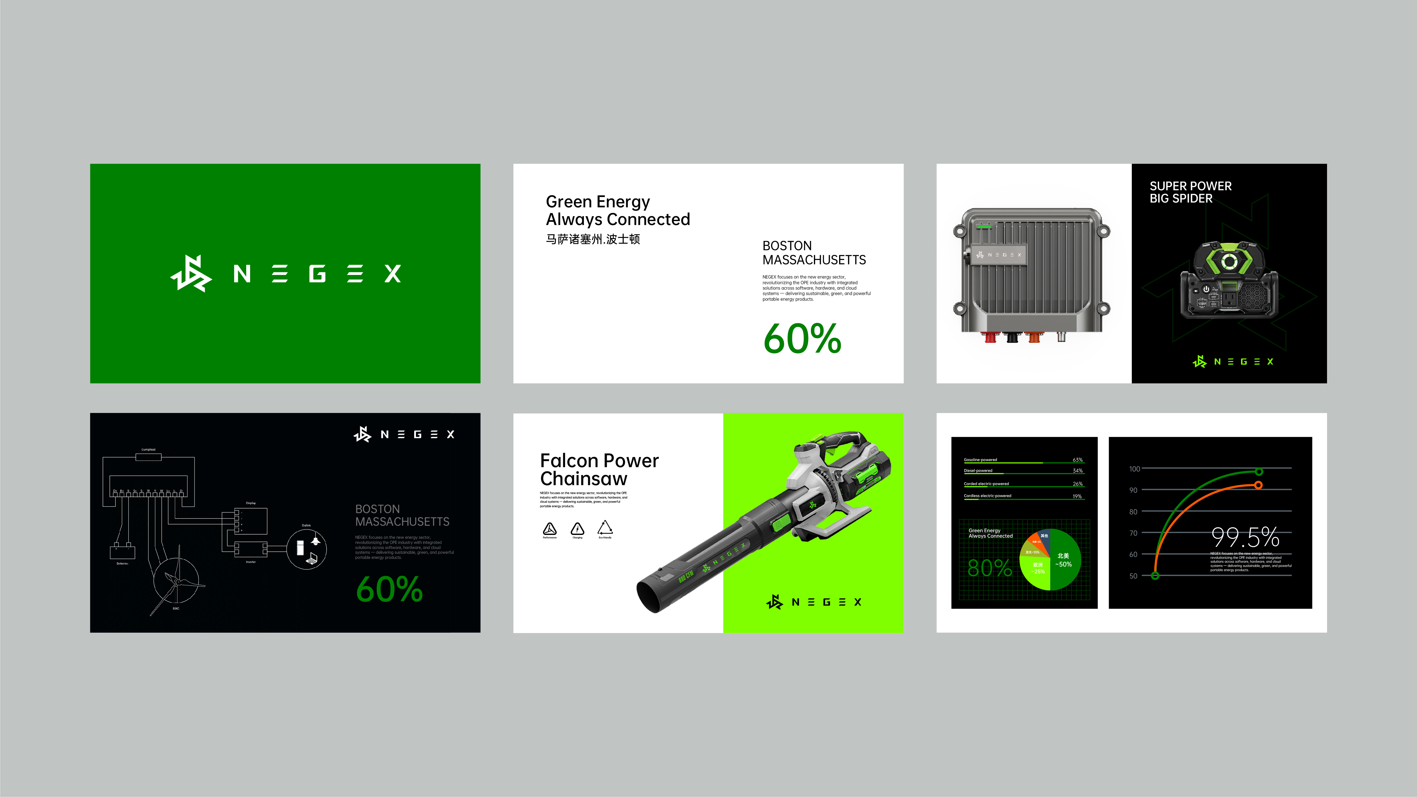 以 N 为核心结构,引入电力闪电与动力三角形态,形成兼具科技性、工业性与力量感的视觉符号体系。采用新能源语境与工程场景兼容的视觉语言,通过结构化图形、工程色系与未来质感建立全球化辨识度。最终输出的品牌系统兼具战略清晰度、行业属性与国际化气质,为 NEGEX 的全球传播与渠道拓展奠定基础。